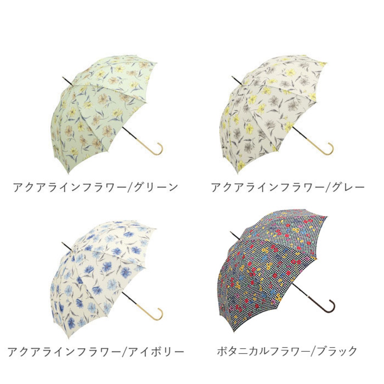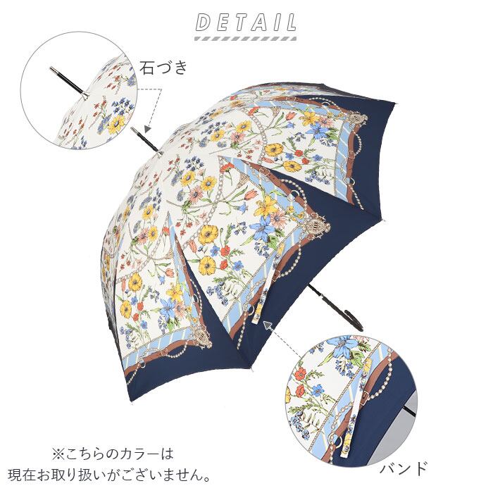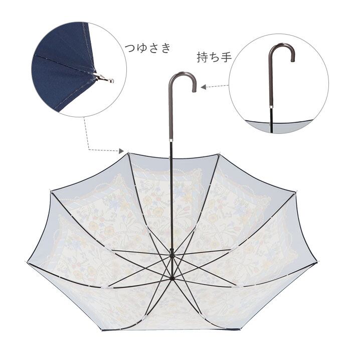 ※傘生地には防水撥水加工を施し、縫製には撥水糸を使用していますが、激しい雨や長時間のご使用では雨が染み込むことがございます。また飾り加工部分(刺繍、ステッチ、バイピング、テープ等)はデザインの特性上、完全な防水撥水加工が難しい場合があり雨が染みやすいのでご注意下さい。