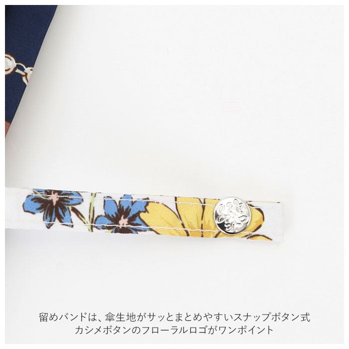 ・留めバンドは、傘生地がサッとまとめやすいスナップボタン式。カシメボタンのフローラルロゴがワンポイント。