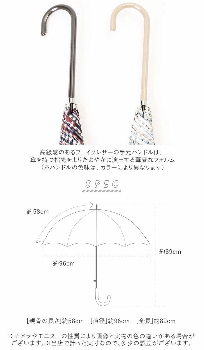 ・高級感のあるフェイクレザーの手元ハンドルは、傘を持つ指先をよりたおやかに演出する華奢なフォルム。(※ハンドルの色味は、カラーにより異なります。)