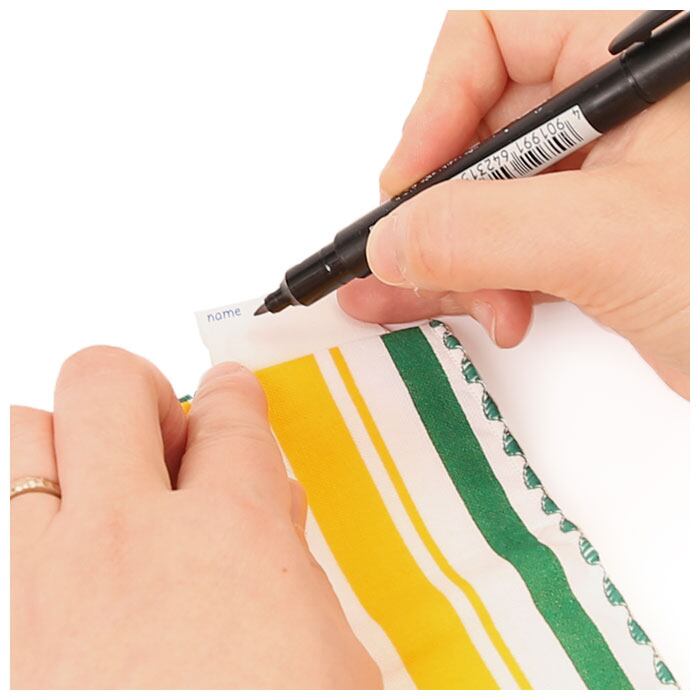 「acchi cocchi」のロゴが入ったタグの裏面に記名が可能。