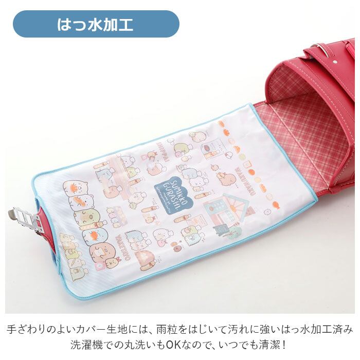 ・ランドセルカバー両面に、すみっコのキャラクターたちの反射シール付き。薄暗い雨の日の登校や夕方の下校時もママパパ安心。