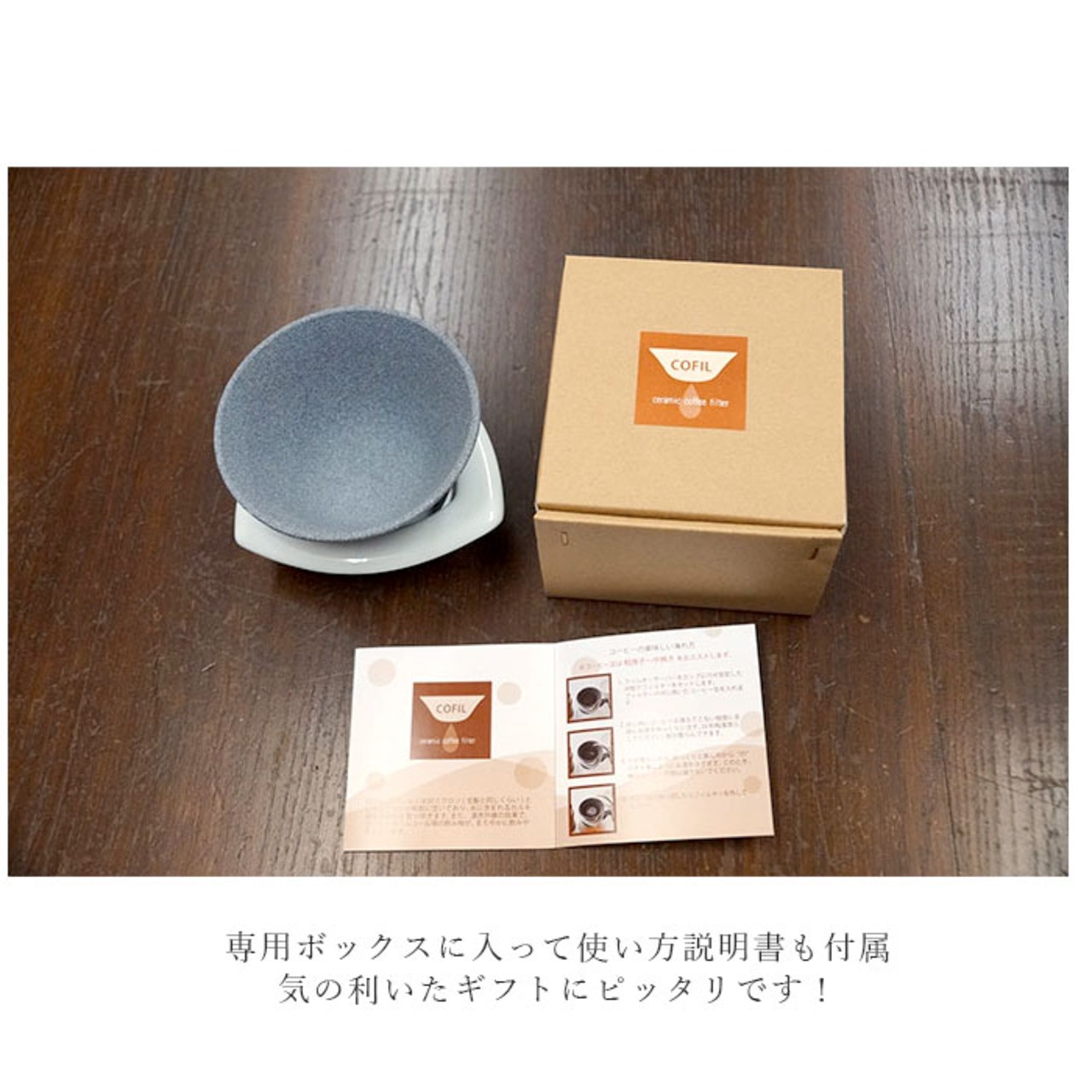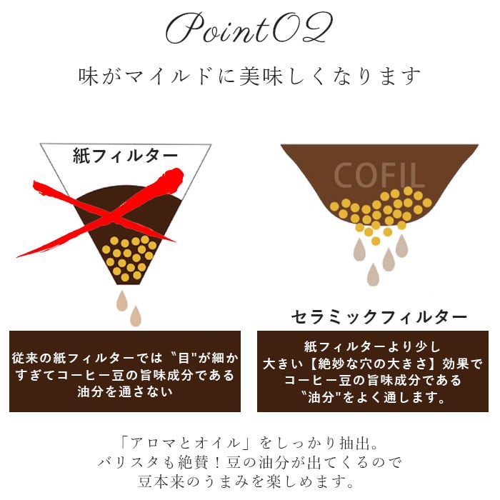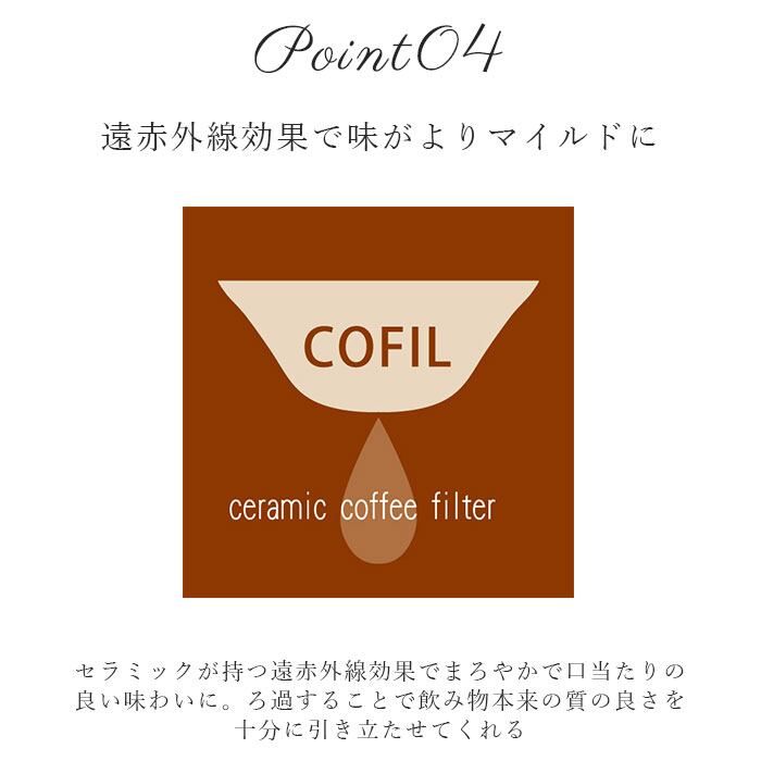 ・「COFIL(コフィル)」は、毛髪と同じくらいの50ミクロンという小さな穴が無数に空いたセラミックフィルター。コーヒー豆のうまみ成分である「油分」をよく通すことで、コーヒーの芳醇な味とコクを引き出す♪