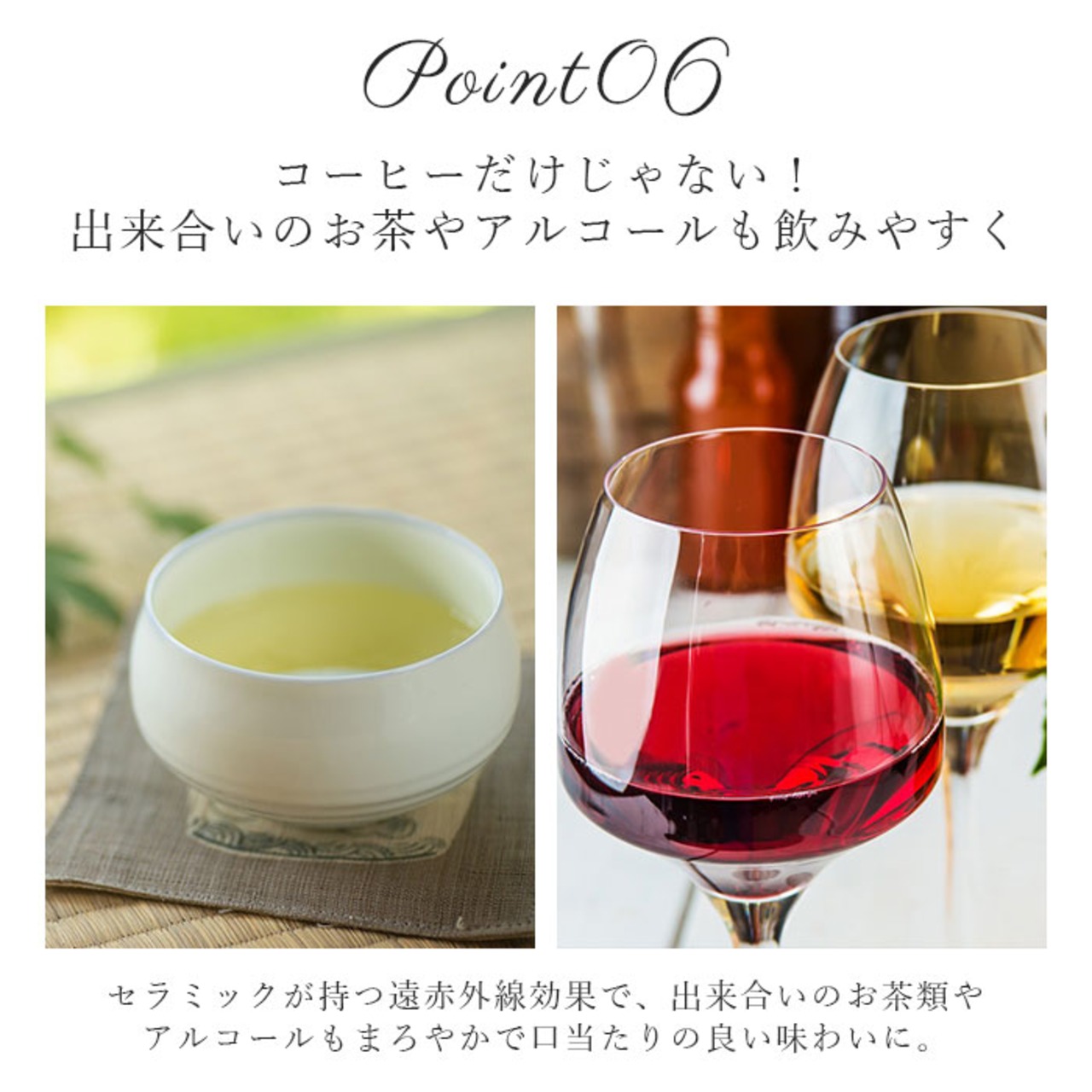 ・またセラミックが持つ遠赤外線効果で、出来合いのお茶類やアルコールもまろやかで口当たりの良い味わいに。ろ過することで、飲み物本来の質の良さを十分に引き立たせてくれる。