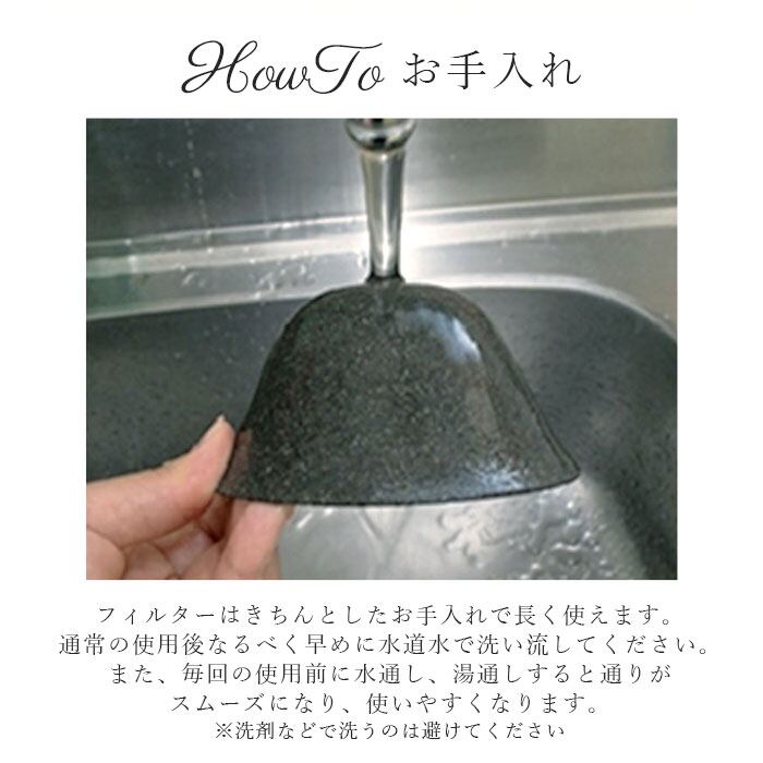 ※フィルターは、きちんとしたお手入れで長く使えます。通常は使用後、なるべく早めに水道水で洗い流してください。また、毎回の使用前に、水通し又は湯通しすると通りがスムーズになり、使いやすくなります。
