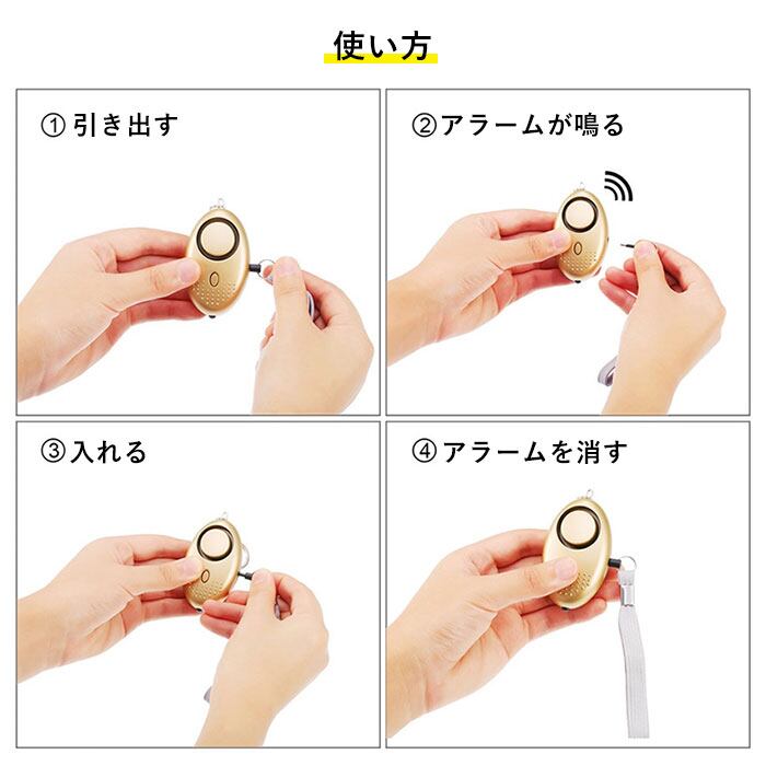 ・緊急時にストラップを引っ張ると本体から「ピン」が抜け、130dBの爆音が発生。その音量はジェット機の離陸音と同レベル!(※ピンを本体に戻すとブザーが停止します。)