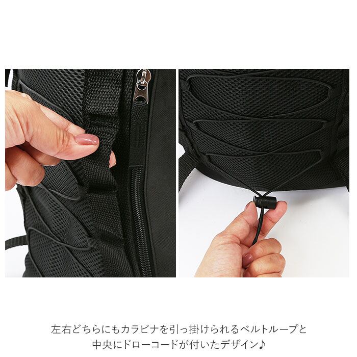 ・左右どちらにもカラビナを引っ掛けられるベルトループと中央にドローコードが付いたデザイン♪