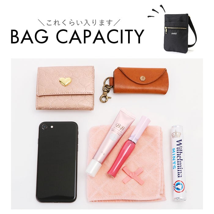 ・お出かけに必要な最小限の小物を収納できる、ミニマルなサイズ感。スマホの出し入れもラクラク。