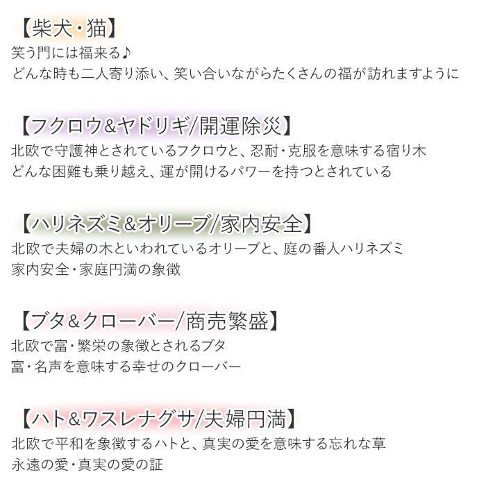 ・北欧で守護神とされているフクロウと、忍耐・克服を意味する宿り木。どんな困難も乗り越え、運が開けるパワーを持つとされている。