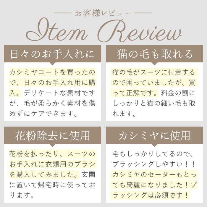 ・馬毛を使用したソフトタッチのブラシは、細かいホコリや毛玉を取るのにピッタリ。100%天然馬毛を使用しているから静電気が起こらず快適にブラッシングができる。