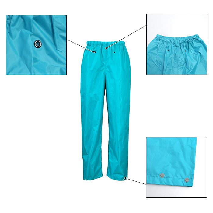 ・ウエストゴム式のレインパンツは脱ぎ着がラクチン。裾部分にパンツの裾幅を3段階に調節できるスナップボタン付き。