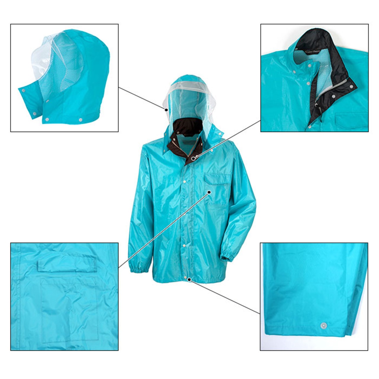 ・フードはクリア部分を上辺から側面まで広げ、周囲の安全が確認しやすく雨の日も視界が良好!首元のスナップボタンでフードの取り外しが可能なため、天気のいい日にはウィンドブレーカーとしても活躍!