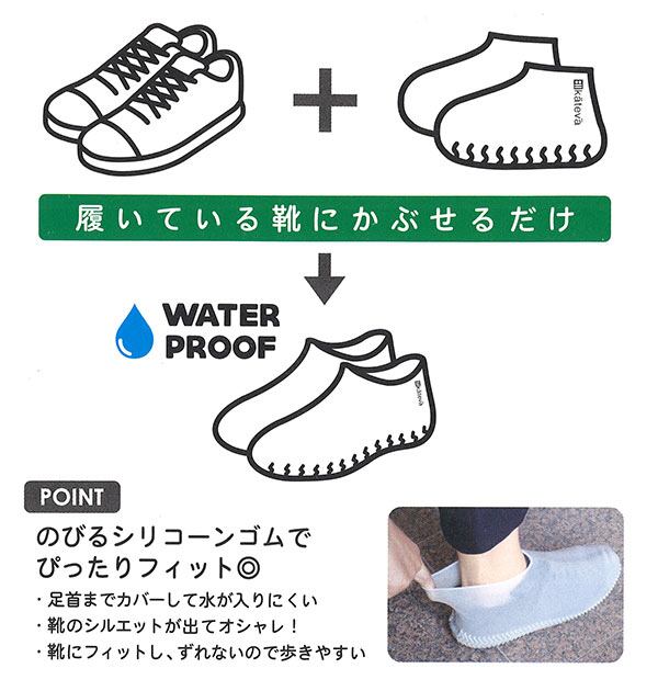 雨や泥汚れから靴をガードする、kateva 防水シューズカバー、シリコーンゴム製です。普段履いている靴にかぶせるだけで使える便利なシューズカバー。伸びるシリコーンゴムで靴にぴったりとフィット。足首まで覆うので水が入りにくい作りになっています。