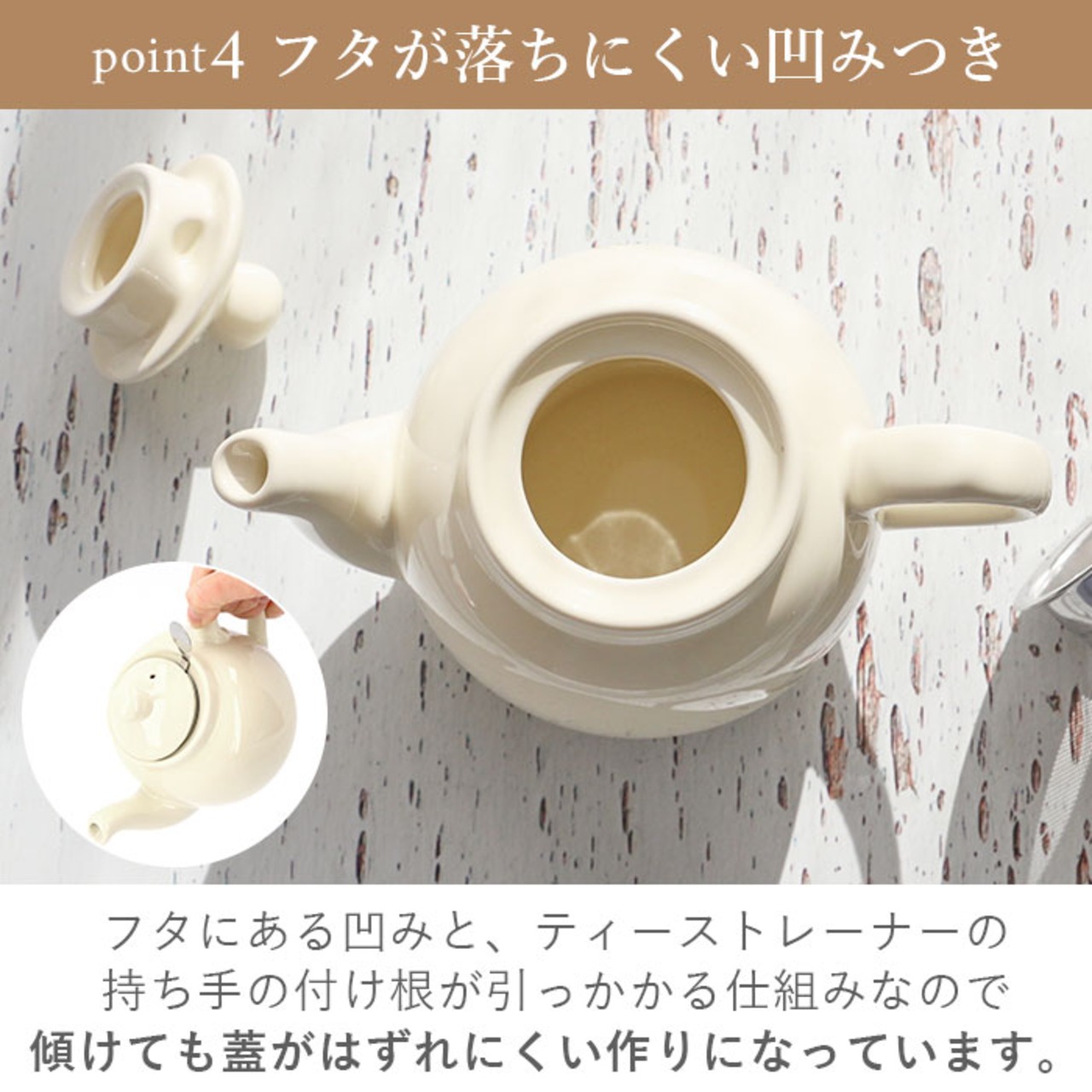 ※フタとティーストレーナーが引っ掛かる仕組みで、傾けてもフタが落ちにくい構造です。