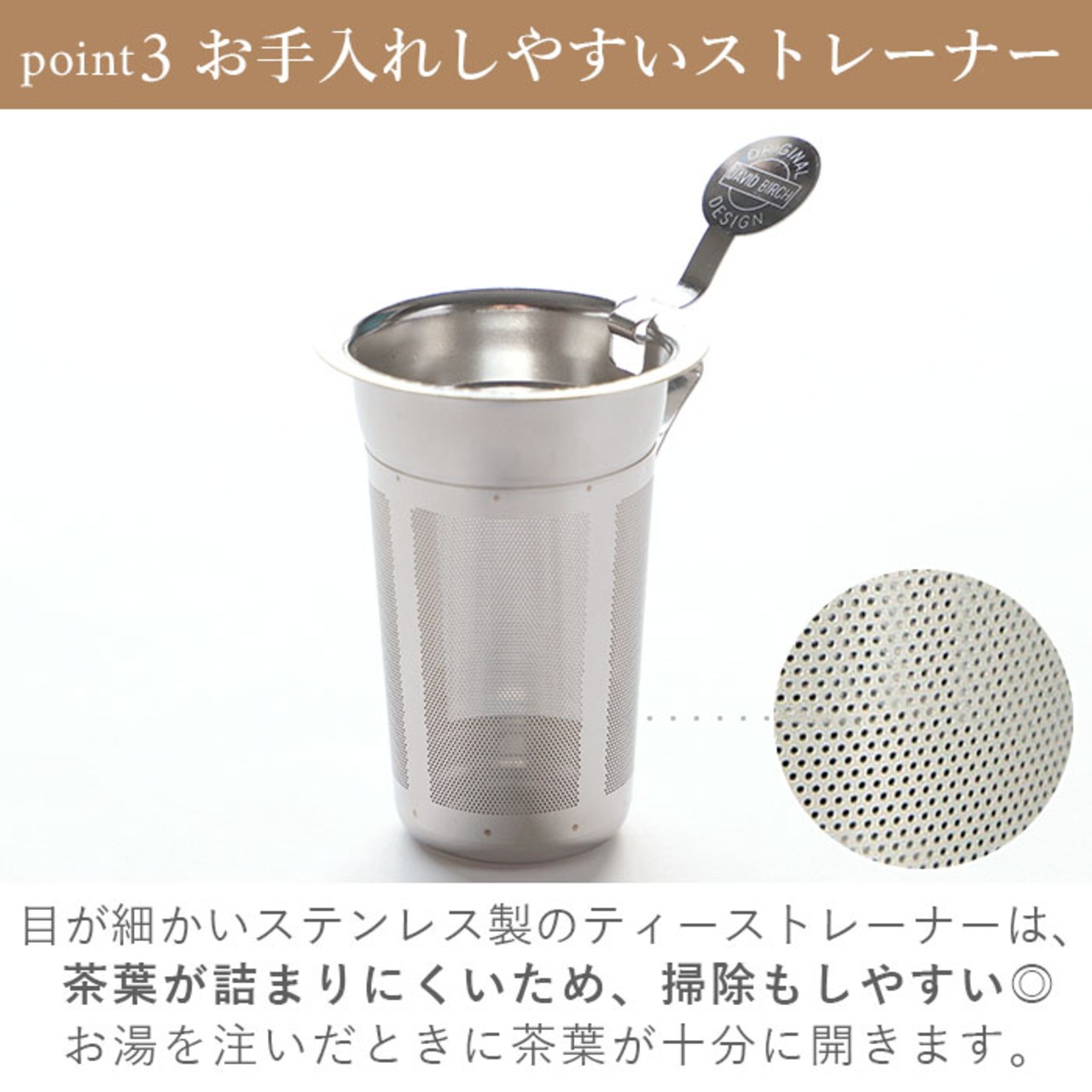 ※ティーストレーナーの目が細かいため、茶葉が詰まりづらくお手入れがしやすくなっております。