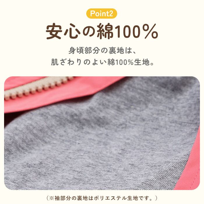 ・身頃部分の裏地は、肌ざわりのよい綿100%生地。(※袖部分の裏地はポリエステル生地です。)