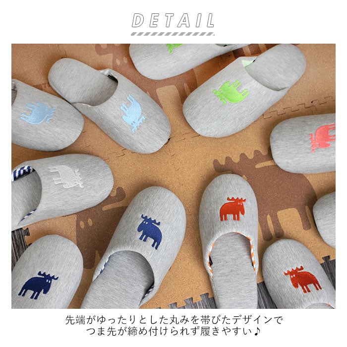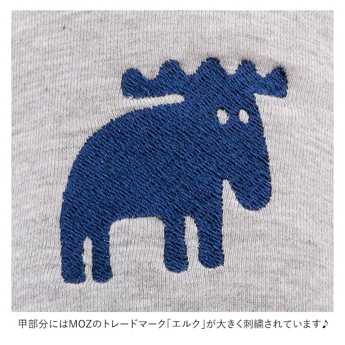 ・フロント、足の甲の部分にはMOZのトレードマーク「エルク」(ヘラジカ)の刺繍が可愛らしく印象的。カラーが豊富なので、ご家族で色違いで揃えられる♪
