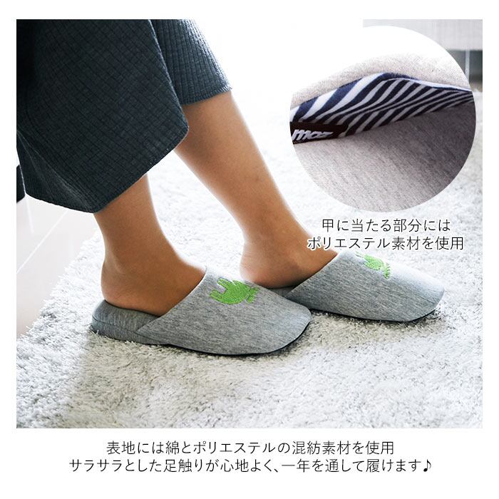 ・表地には綿とポリエステルの混紡素材、足の甲に当たる部分にはポリエステル素材を使用し、サラサラとした足触りが心地よく一年を通して履ける♪