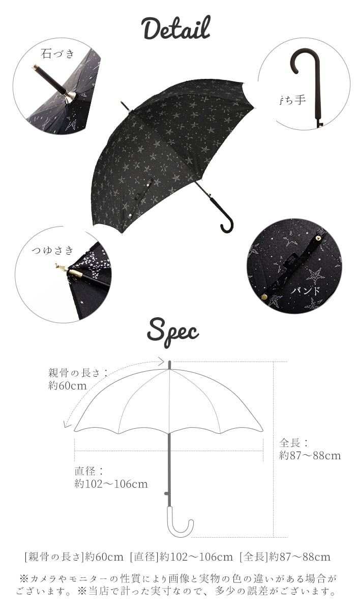 ・傘生地には、紫外線防止効果のあるポリエステル素材を使用。晴雨兼用で使えるのが嬉しい。