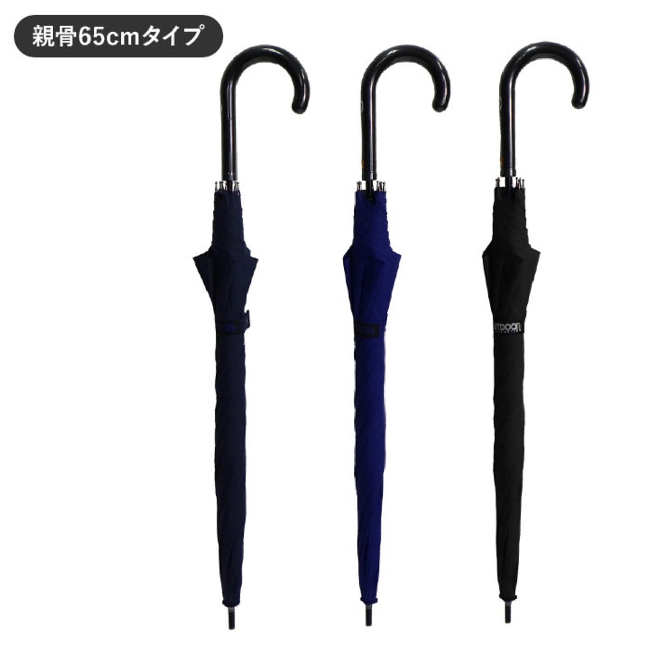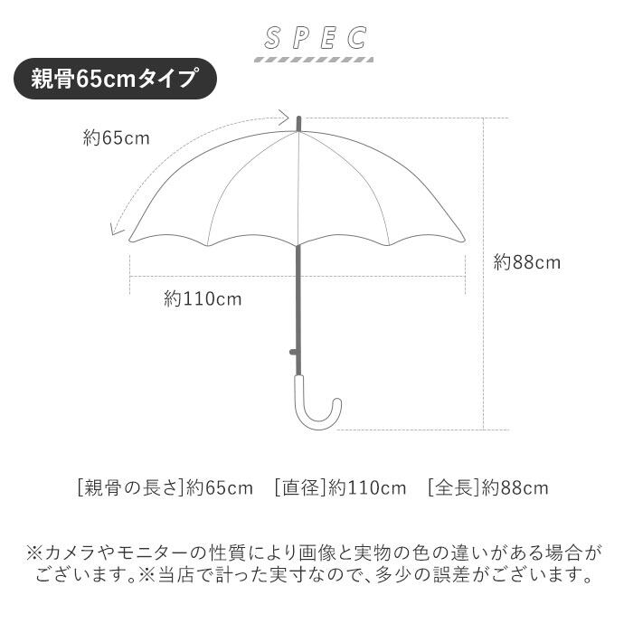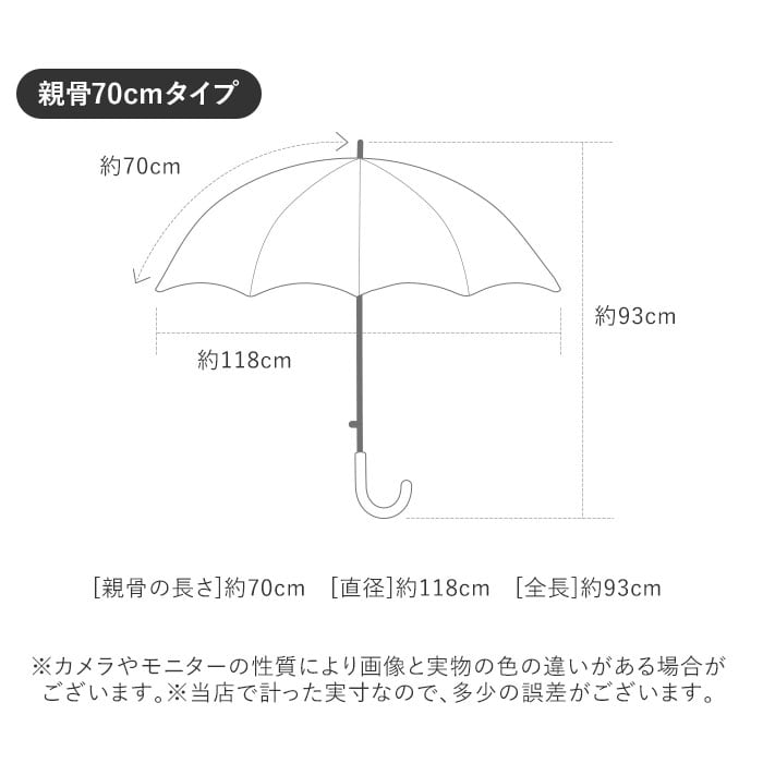 ・親骨の長さは65cmタイプと70cmタイプの2サイズ展開。雨が強めの日でも身体や荷物が濡れにくい、直径約110cmと118cmの大判サイズ。
