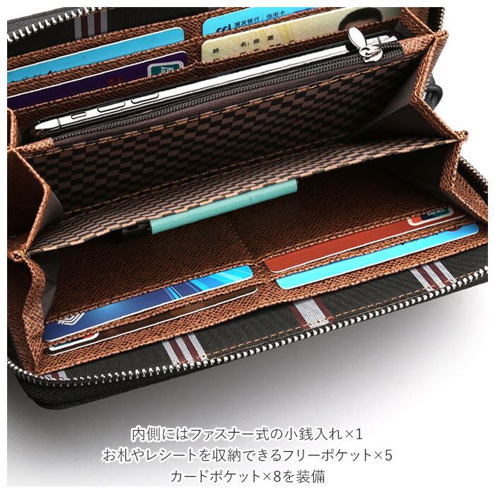 ・内側にはファスナー式の小銭入れ×1、お札やレシートを収納できるフリーポケット×5、カードポケット×8を装備。