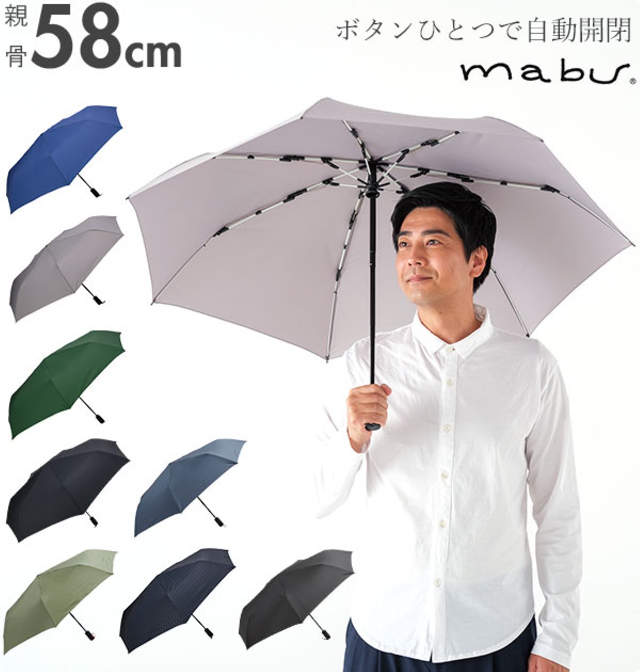 mabu マブの高強度×自動開閉の折り畳み傘、高強度折りたたみ傘ストレングスミニAUTOです。しっかりしてとっさの雨や風にもさっと開いて対応できる折り畳み傘です。一般の折り畳み傘より親骨が太いグラスファイバーを使用し、通常より多く配した親骨を支えるパーツで耐久性を向上。風を受けても壊れにくい構造になっています。車の乗り降りや荷物が多い時にもワンタッチで簡単に開いて便利です。