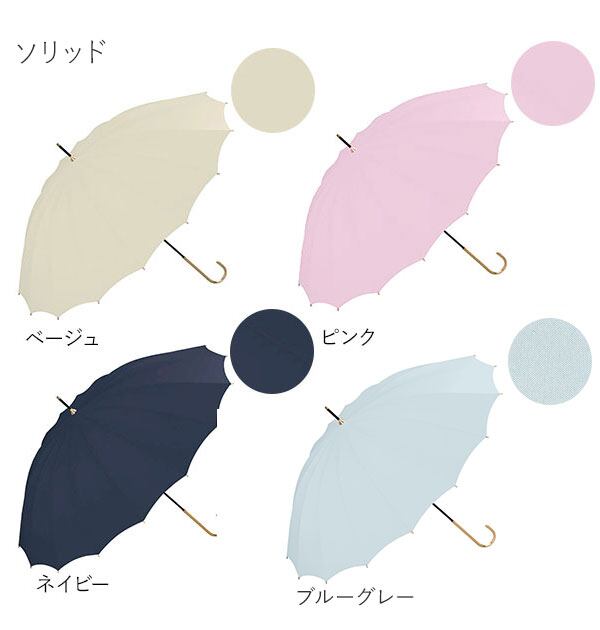 親骨にグラスファイバーを使用した、16本骨タイプの傘です。 雨傘としてお使いいただくことを主としておりますが、 紫外線防止効果があり、日傘としてもお使いいただけます。 紫外線遮蔽率は、濃色が約90%以上、淡色が約80%になります。 手開き開閉式で、カラーバリエーションもあるので、男女問わず使えます。