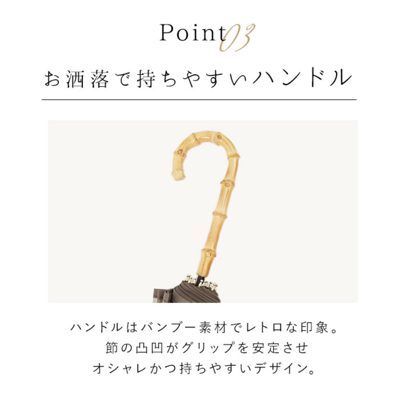 ・たおやかな指先を演出する、上品な雰囲気のバンブーハンドルが雨の日のスタイルのアクセントに。竹の節で滑りにくいのも使いやすさのポイント。