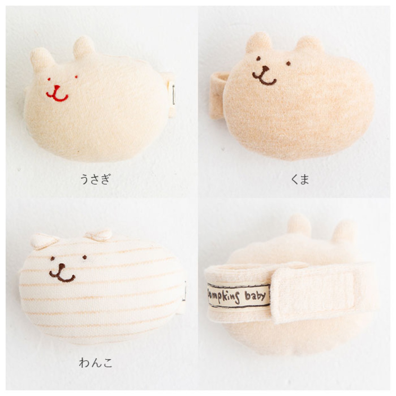 ・ナチュラルな生地の色合いと、わんこやくまなど可愛いマスコットをかたどったフォルムで、出産祝いにもぴったり。
