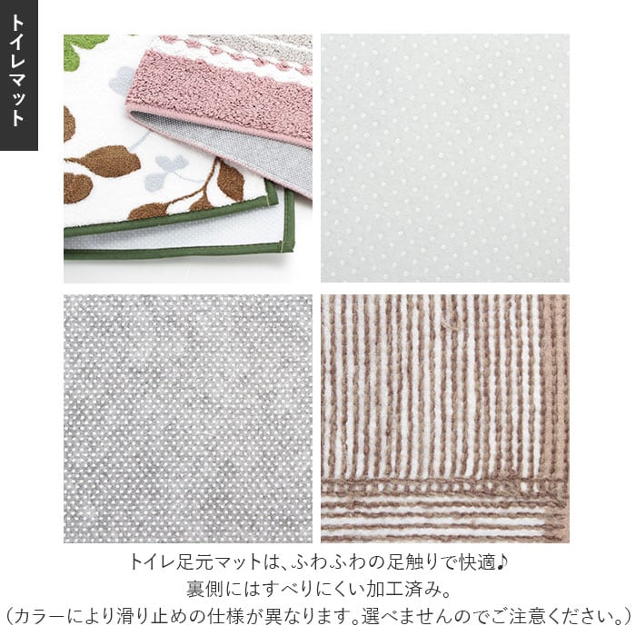 ・ふっくらと毛足のしっかりとしたパイル糸を使用したトイレ足元マットは、ふわふわの足触りで快適♪裏側にはすべりにくい加工済みで、マットのずれを直す手間もなくてラクチン♪