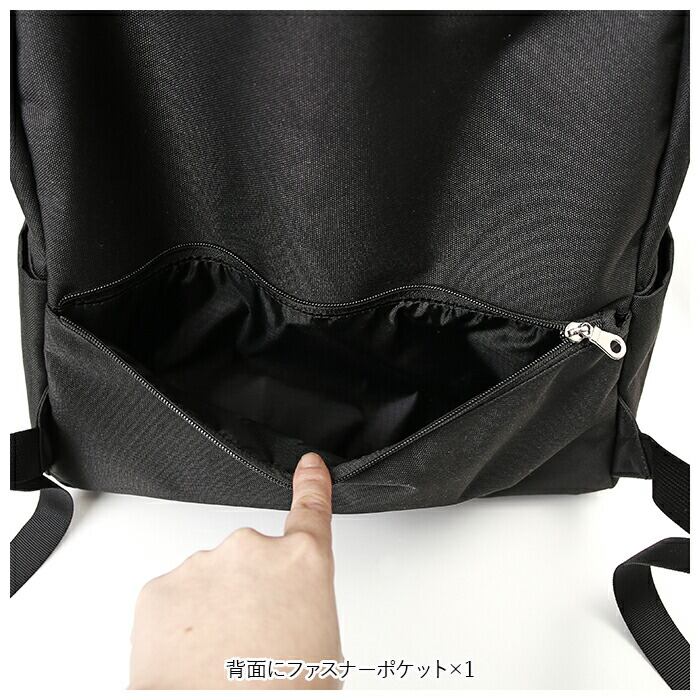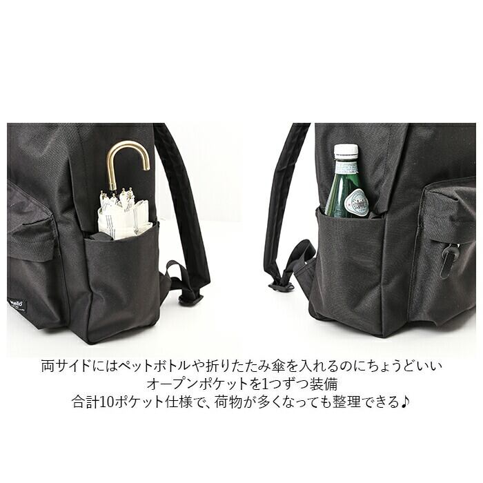 ・背面にファスナーポケット×1、両サイドにはペットボトルや折りたたみ傘を入れるのにちょうどいい、オープンポケットを1つずつ装備。