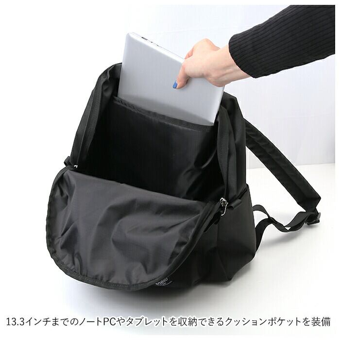 ・メインルームは小物の仕分けに便利なオープンポケット×2、ボトルポケット×2、13.3インチまでのノートPCやタブレットを収納できるクッションポケットを装備。