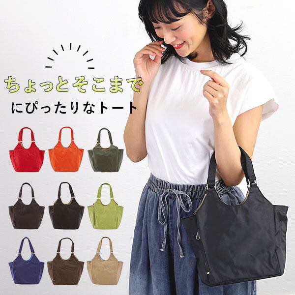 ちょっとそこまでにちょうどいい♪色数が多くて、カラーコンビがポイントの手提げバッグです。あおりポケットやファスナーポケット、500mlペットボトルも横にすれば入るなど、使い勝手がGOOD◎小ぶりでも収納力ばっちり!ランチバッグにもお勧めです♪