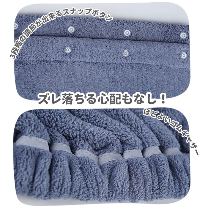 3段階の調節が出来るスナップボタンとほどよいゴムギャザーで、ズレ落ちる心配もなし!
