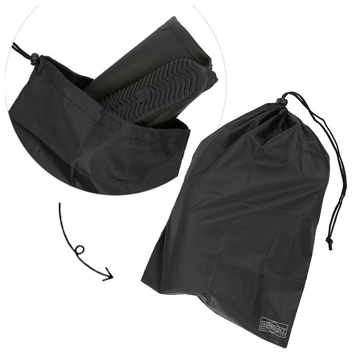 ・ブーツの筒部分をくるくると丸めて、付属の収納袋に入れればとってもコンパクトに。履き口のドローコードはゴム製なので、ブーツを丸めて固定がしやすい仕様。