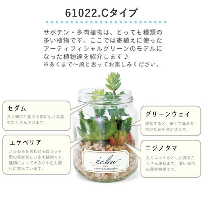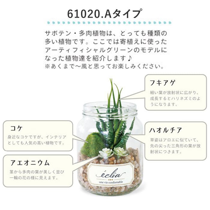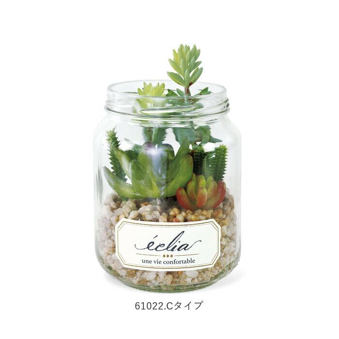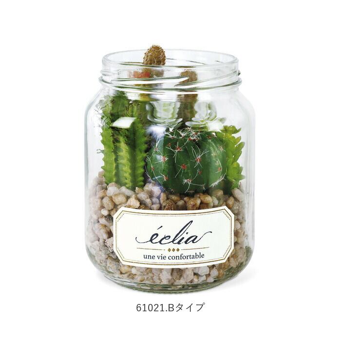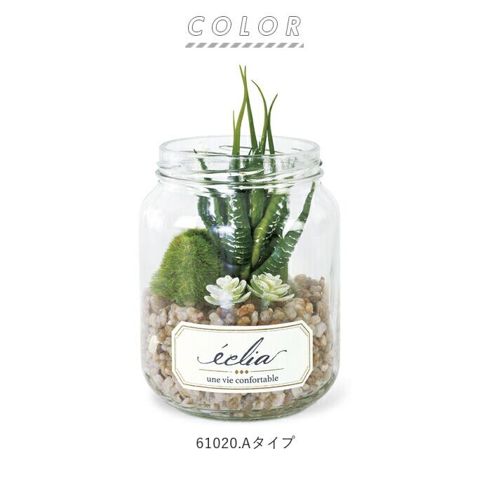 ・多肉植物やサボテンをスタイリッシュな瓶の中で寄せ植えにしたテラリウム風で、まるで本物の植物のような外観。フェイクグリーンとは思えない出来栄えで、とってもオシャレ♪