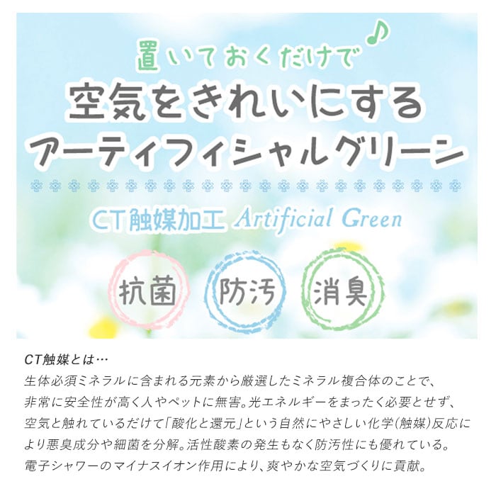 ・インテリアとしてお部屋に飾っておくだけで消臭・防汚・抗菌の効果が期待できるおしゃれなフェイクグリーン。