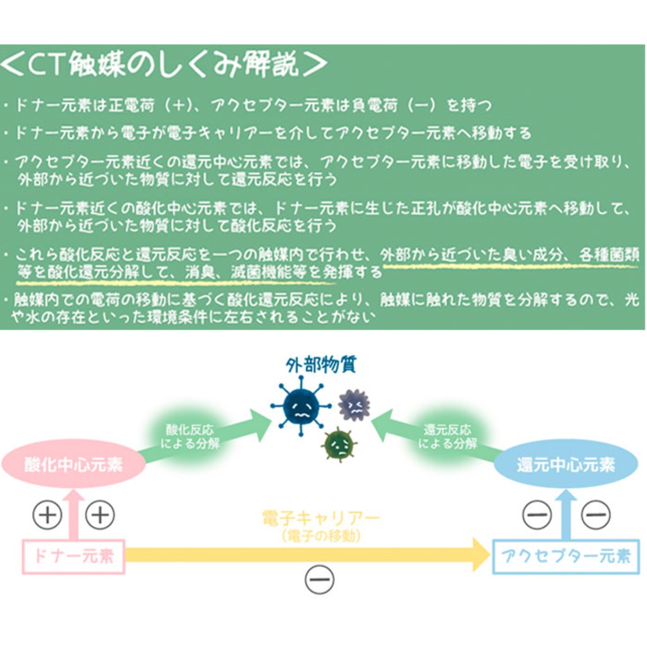 ・「CT触媒」とは、生体必須ミネラルに含まれる元素から厳選したミネラル複合体のこと。非常に安全性が高く、人体にも無害なので、小さなお子さまやペットのいるご家庭でも安心。