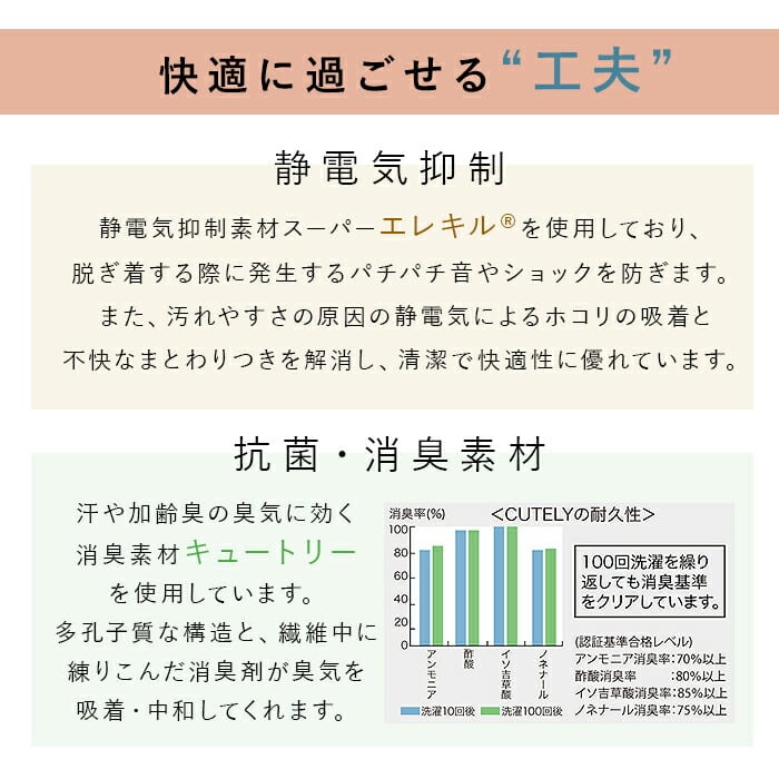 ・静電気を防ぎ、埃の吸着、不快なまとわりつきを解消。