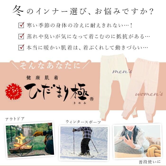 ・1枚で肌着3枚分の暖かさ♪3重構造身頃で保温力バツグン!確かな機能性と驚きの保温力!速乾性、透湿性に優れたひだまりダンロン(R)を使用!身頃3重(厚手)&袖部2重(薄手)で秋冬用に最適。ひだまり極。(ズボン下/パンツ下)