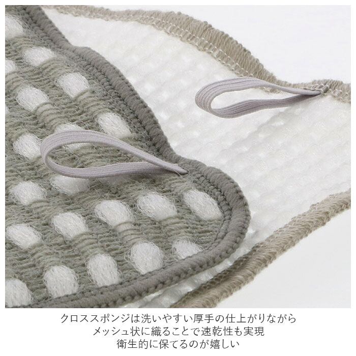 ・クロススポンジは洗いやすい厚手の仕上がりながら、メッシュ状に織ることで速乾性も実現。衛生的に保てるのが嬉しい。