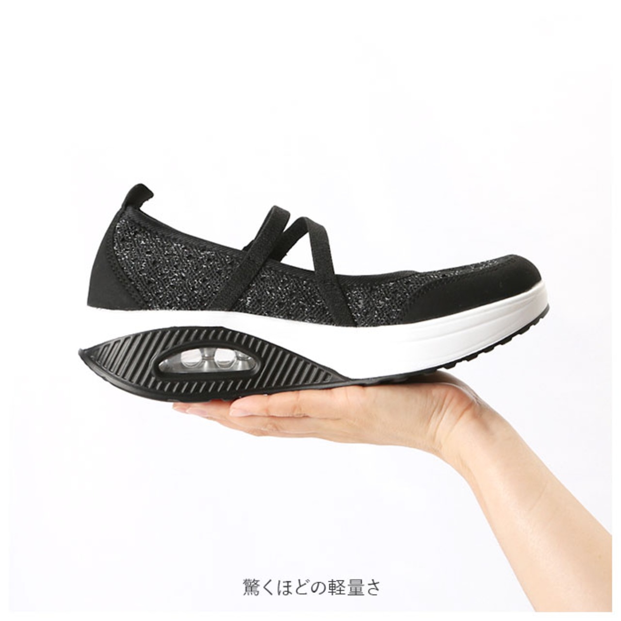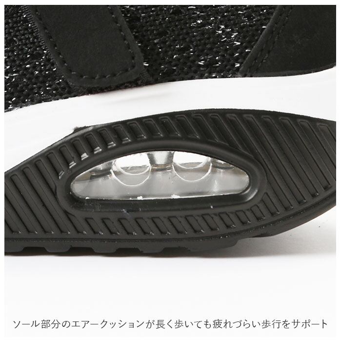 ・驚くほどの軽量さに加え、ソール部分のエアークッションが長く歩いても疲れづらい歩行をサポート。