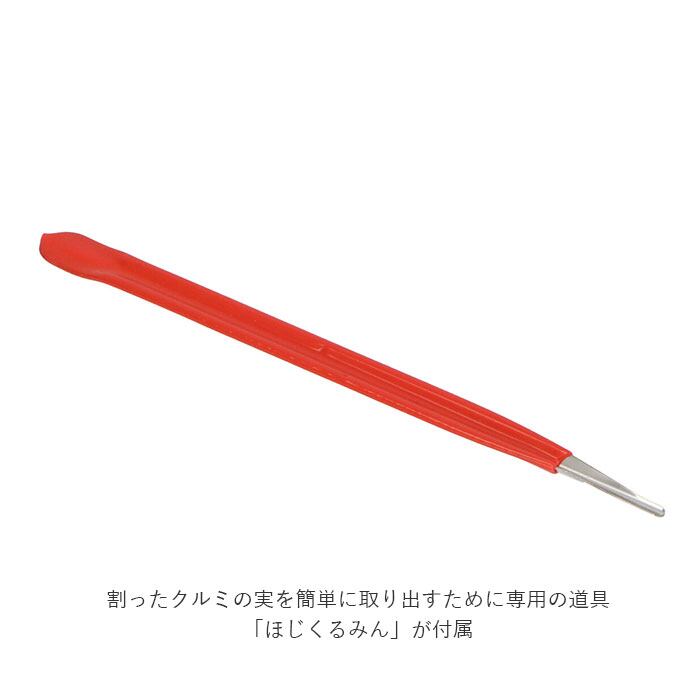 ・割ったクルミの実を簡単に取り出すために専用の道具、「ほじくるみん」が付属!半分割れたクルミの殻から、実を簡単に掻き出せる。