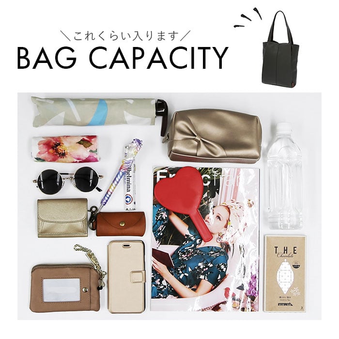 ・深さがあり、A4サイズのファイルが縦向きにすっぽり収まるサイズ感。長財布やペットボトル、コスメポーチなど、お出かけに必要な荷物をまとめて収納できる。