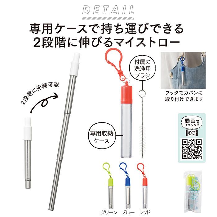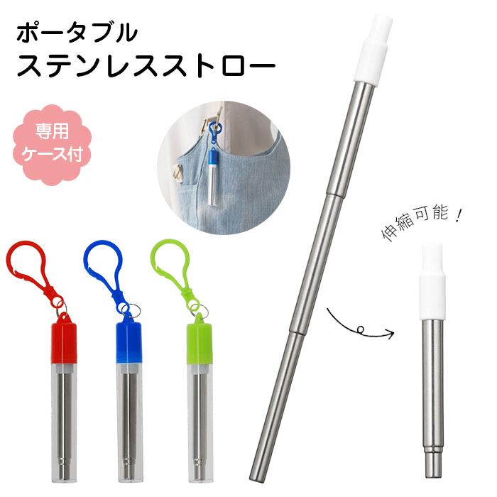 ストロー 繰り返し 通販 エコ 3色 ポータブル ステンレスストロー 伸縮式 マイ 携帯ストロー ステンレス製 ひんやり 省エネ 携帯用 フック レッド ブルー グリーン プレゼント プチギフト