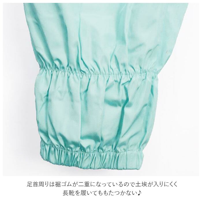 ・足首周りは裾ゴムが二重になっているので土埃が入りにくく、長靴を履いてももたつかない♪