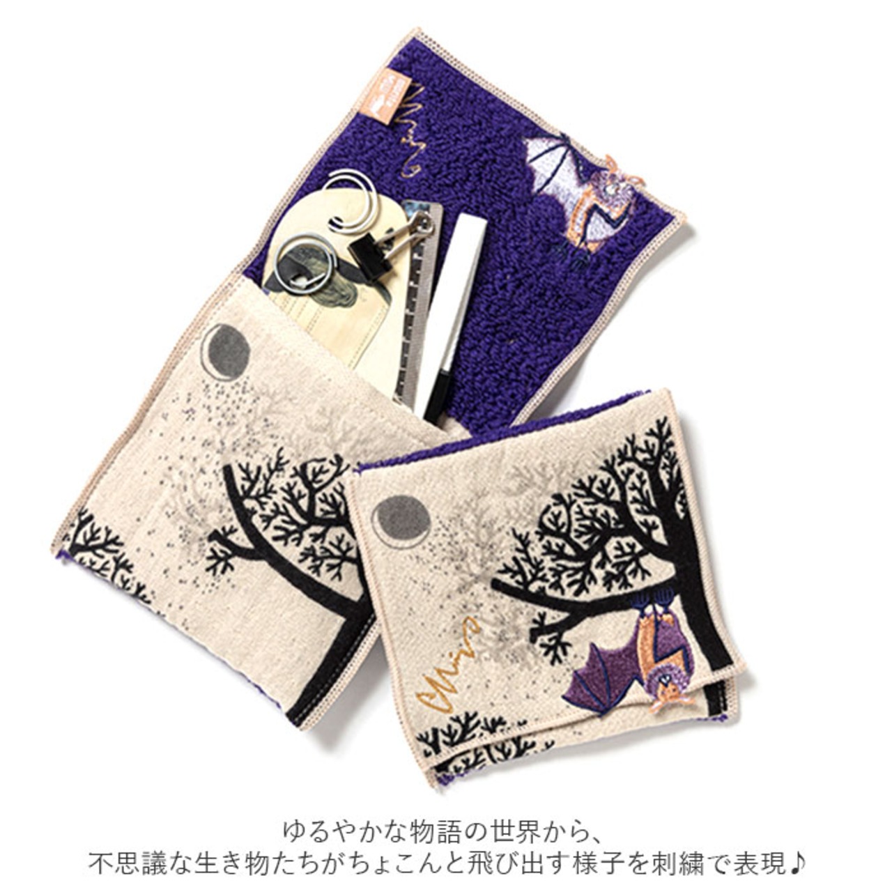 ・挿絵画家、森田MiW×タオルメーカー楠橋紋織のコラボブランド「moritaMiW」のポーチハンカチが新登場。