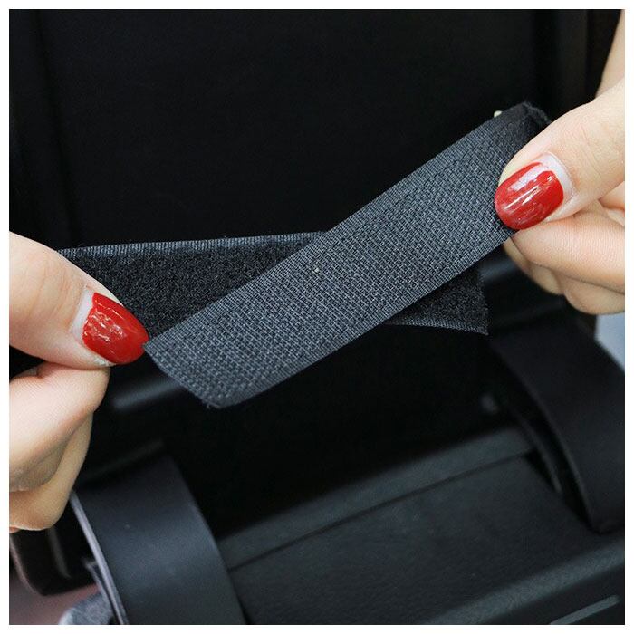 ・2本のバックルストラップを運転席・助手席それぞれのヘッドレストステーに留めてから、底部のマジックテープを開いた状態のアームレストボックスで固定するだけの簡単取り付け!