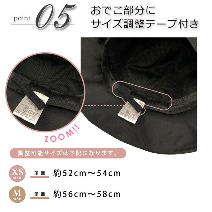 ・5.おでこ部分にサイズ調整テープ付き。XSはお子様でもご使用いただけるサイズ感♪