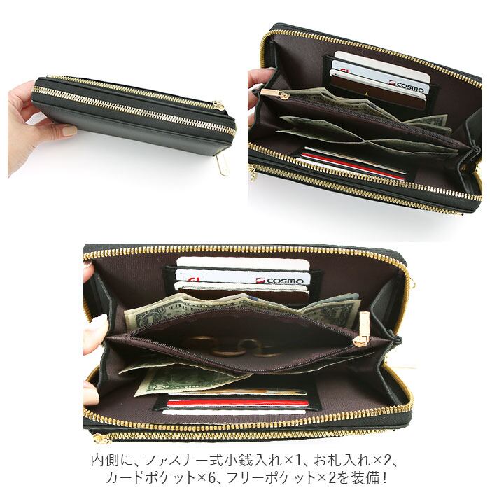 ・内側に、ファスナー式小銭入れ×1、お札入れ×2、カードポケット×6、フリーポケット×2を装備!