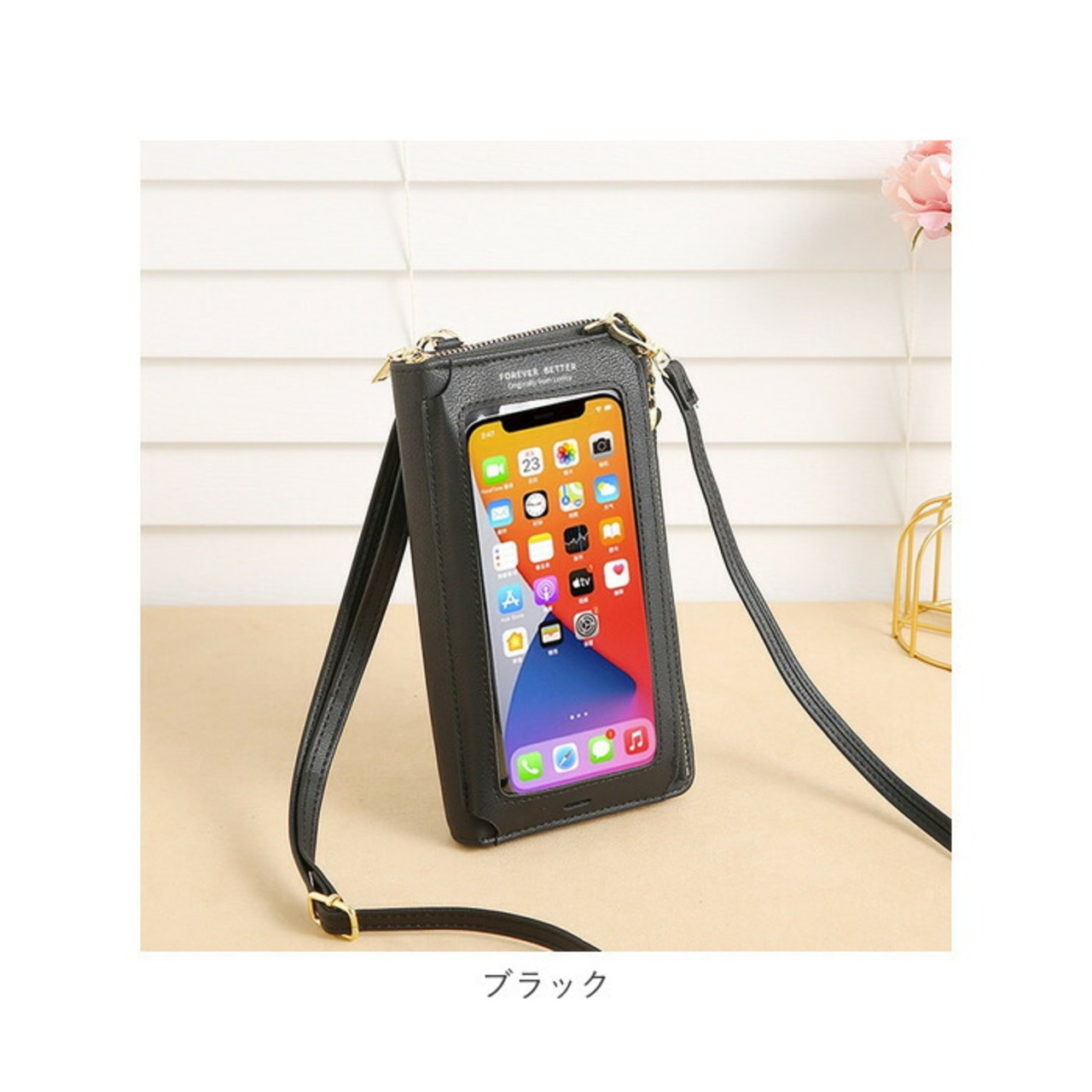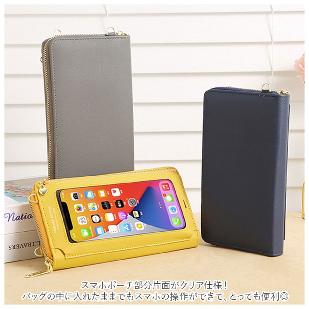 ・スマホポーチ部分片面がクリア仕様!バッグの中に入れたままでもスマホの操作ができて、とっても便利◎(※保護フィルムを貼っている場合などは、反応しにくい可能性があります。)